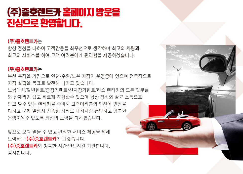 상호:(주)중호렌트카 | 사업자등록번호: 128-81-85005 | 대표:김용인 | 개인정보관리책임자:김용인